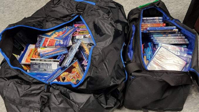 - A thief was definitely trying to add to his DVD collection. Grenville County OPP say they arrested a 41-year-old man Tuesday night in Kemptville and recovered two large bags with 195 DVDs. Police say the $5,000 in digital video discs have been returned to their owner.