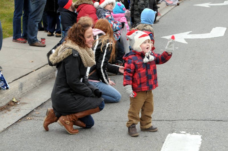 Cole Martin, 3, of Brockville was pretty excited about taking in his first parade as he waves to people on the floats as Kim Werkman looks on. Scenes from the Santa Claus Parade on Saturday, Nov. 28, 2015 in Brockville, Ont. (Newswatch Group/Bill Kingston)