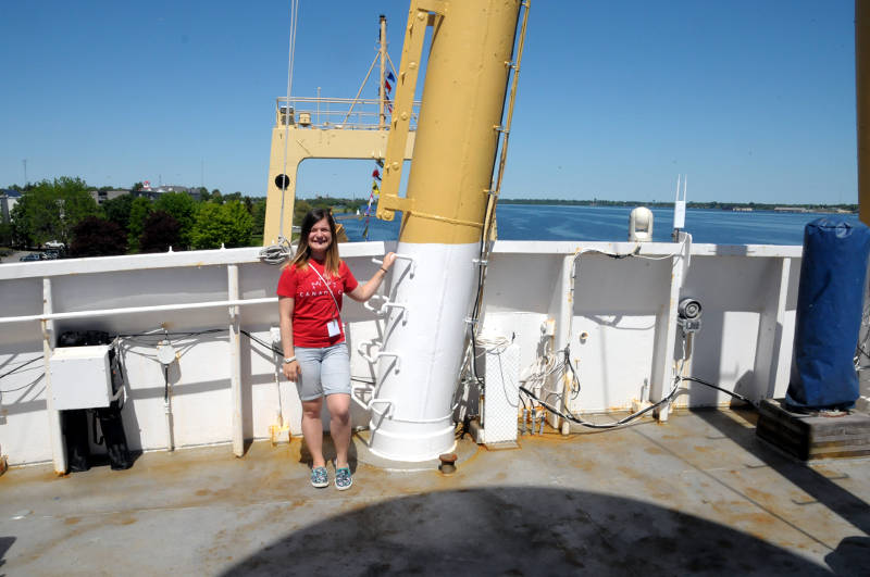 Felicity Feinman, communications spokeswoman for Canada C3, stands on Monkey Island, the highest point on the ship. Scenes from the Canada C3 stop in Prescott, Ont. Wednesday, June 7, 2017. (Newswatch Group/Bill Kingston)